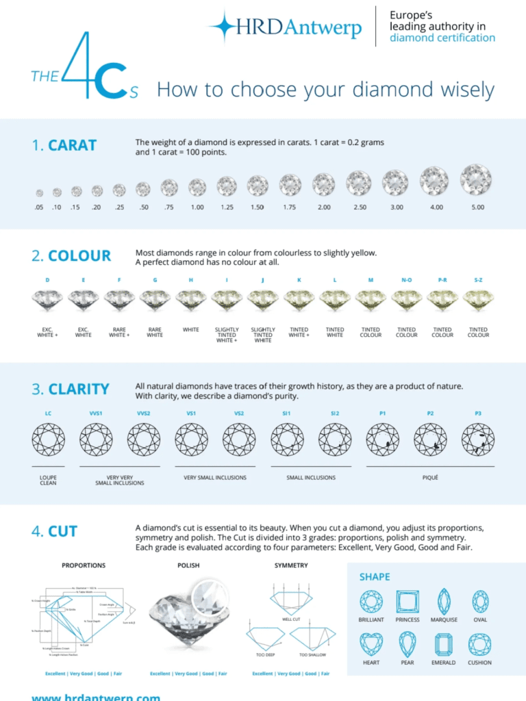 Cut Grade (GIA only for round brilliants) evaluates proportions, symmetry, and polish. GIA grades cut from Excellent to Poor. HRD provides a similar assessment through its proportions analysis. The cut grade has the most significant impact on a diamond’s visual performance — a well-cut diamond will exhibit superior brilliance, fire, and scintillation.